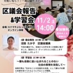 「議会や議員活動のことを少しでも知ってもらいたい、関心を持ってもらいたい、地域の課題を一緒に考えたい」という思いで年に4回ある定例議会のあとに開催している区議会報告&学習会のご案内です。