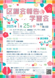 20250125_議会報告会&学習会チラシ(0107)のサムネイル昨年11月27日~12月13日まで行われた第4回定例会では一般質問をしました。今回は一般質問の報告と参加者のみなさまの意見を伺ったり、質問に答える時間を多くとりたいと考えています。
