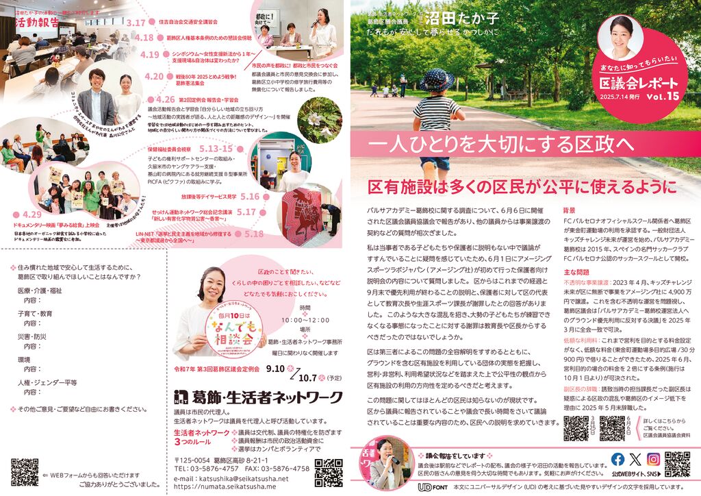 区議会レポートVol.15にはバルサアカデミー葛飾校の運営に関する問題、マイナ保険証や区で行う婚活支援などについてまとめました。
