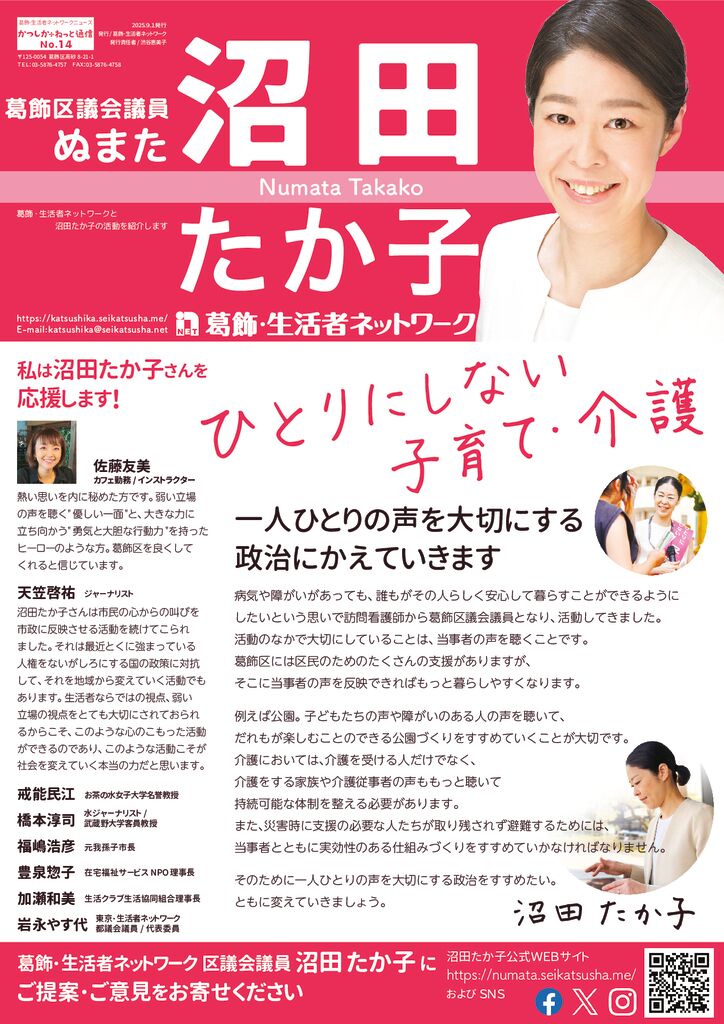 一人ひとりの声を大切にする政治に変えていきます! 沼田たか子の6つの提案 ~だれもが安心して暮らせるかつしかに~ 沼田たか子にご提案・ご意見をお寄せください