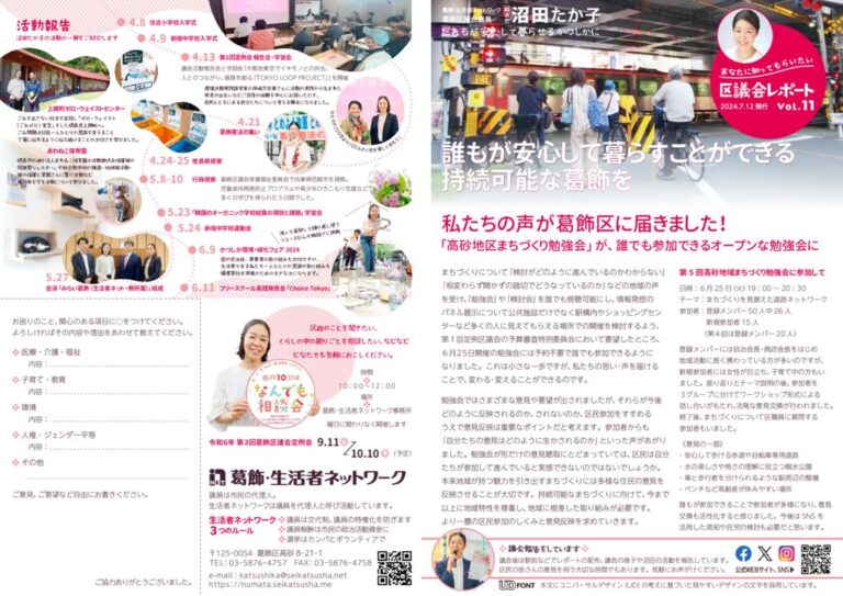 6月5日から6月21日まで開催された第2回定例議会が閉会しました。 区議会レポートVol.11には一般質問の内容や このたび結成した会派「みらい葛飾(生活者ネット・無所属)」についてまとめました。 お...